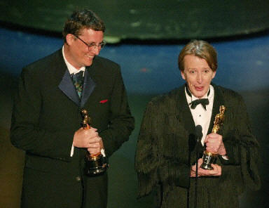 中新網北京3月25日消息:《指環王》獲得最佳化妝獎,理查德·泰勒和匹特·歐文接過奧斯卡金人,此外,該片還獲得了最佳攝影大獎。(法新圖)