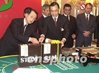 澳門博彩股份有限公司一日凌晨正式接手經營澳門旅游娛樂有限公司屬下的十一間賭場,新的博彩合約正式生效。圖為交接場面。中新社記者 宗金柱 攝
