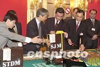 澳門博彩股份有限公司一日凌晨正式接手經營澳門旅游娛樂有限公司屬下的十一間賭場,新的博彩合約正式生效。圖為兩家公司于零點時分在賭場交接。中新社記者 宗金柱 攝