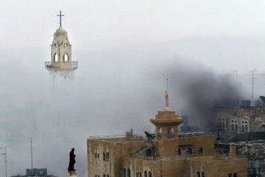 在耶路撒冷市和西岸城市伯利恒之間地一處檢查站,一名以色列士兵與女友相擁而吻。以軍進入了古城伯利恒,并向教堂開火,一名神父被殺,另外六名修女受傷。法新圖