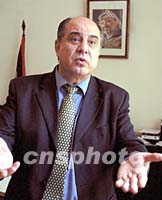 巴勒斯坦駐華大使薩法里尼三日在北京的大使館向采訪他的媒體記者說:他前兩天在與阿拉法特主席通電話時,阿拉法特表示必須斗爭到底,決不屈服。在談到近日巴以沖突的形勢時說:目前,國際社會已經(jīng)開始發(fā)揮作用,承擔他們的責任。中新社圖 李剛 攝