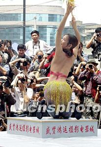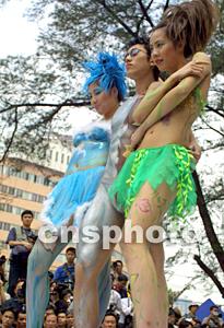 廣州某攝影器材城為吸引顧客,六日上午在門口公開展示人體彩繪,吸引上百名發燒友前來拍攝。中新社圖 柯小軍 攝