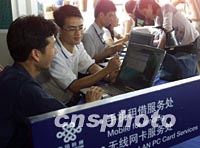 中國聯(lián)通的工作人員四月九日在海南博鰲為采訪論壇的中外記者安裝無線上網(wǎng)卡,會(huì)議期間中國聯(lián)通將為記者提供免費(fèi)的無線高速上網(wǎng)服務(wù)。中新社記者 滿會(huì)喬 攝