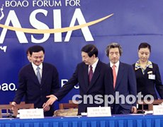 ![]() 博鰲亞洲論壇首屆年會十二上午在海南博鰲開幕,國務院總理朱镕基、日本首相小泉純一郎、泰國總理他信(左一)出席開幕式。中新社圖 滿會喬 攝