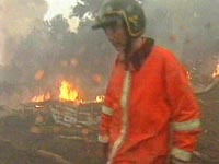 四月十五日上午十一時許,中國國際航空公司一架波音767客機在朝鮮釜山機場附近山上墜毀,救援人員在失事現場滅火救人。