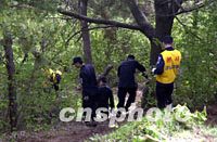 韓國搜尋人員十八日在金海中國飛機失事樹林里,尋找最后的失蹤者。中新社記者 陶光雄 攝