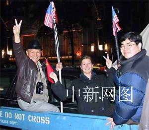 美國東部時間4月28日午夜,千余名紐約當地華僑華人聚集在曼哈頓華爾道夫酒店門前,熱烈歡迎中國國家副主席胡錦濤一行首次訪美。歡迎人群中也不乏一些外國友人。趙海燕 攝影