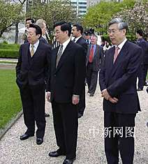 美國東部時間四月二十九日下午,中國國家副主席胡錦濤(中)在聯合國副秘書長陳健(左)、中國常駐聯合國大使王英凡(右)的陪同下參觀聯合國總部。中新社記者 陳建 攝
