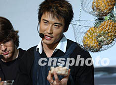 中國首席男模胡兵,十一日在北京國際展覽中心“2002萊卡風(fēng)尚之城”的風(fēng)尚廚房里,為前來參觀的賓客展示廚藝。作者:東方