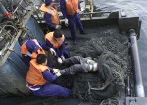 中新網(wǎng)大連5月11日消息:北海艦隊某部救撈船官兵5月11日傍晚時分又打撈出一具男性遇難者遺體,至此,“五·七”空難遇難者遺體已有七十五具被打撈出水。