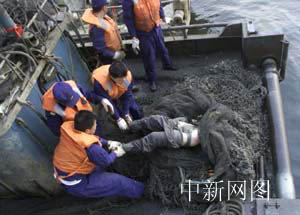 北海艦隊某部救撈船官兵5月11日傍晚時分又打撈出一具男性遇難者遺體,至此,“五·七”空難遇難者遺體已有七十五具被打撈出水。(中新社記者:王麗南攝)