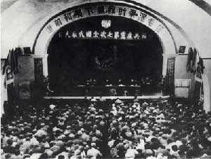 圖文:中國共產黨第七次全國代表大會簡介 2002年05月14日 17:10 ![]() 圖為七大會場 1945年4月23日至6月11日,中國共產黨第七次全國代表大會在延安楊家嶺中央大禮堂召開,歷時50天。出席大會的正式代表547名,候補代表208名,共計755名,代表全國121萬黨員。大會選出毛澤東、朱德、劉少奇、周恩來、任弼時、林伯渠、彭德懷、康生、陳云、陳毅、賀龍、徐向前、高崗、張聞天、彭真15人組成主席團,選舉任弼時為大會秘書長、李富春為副秘書長。 大會的主要議程是:毛澤東作《論聯合政府》的政治報告;劉少奇作《關于修改黨的章程的報告》;朱德作《論解放區戰場》的軍事報告;周恩來作《論統一戰線》的報告;任弼時作關于黨的歷史問題的報告;通過新的黨章,選舉新的中央委員會。6月9日,選舉中央委員會委員4 4名。6月1 0日,選舉中央委員會候補委員3 3名。6月1 1日,大會閉幕,毛澤東致題為《愚公移山》的閉幕詞。