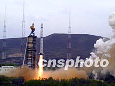 中國“長征四號乙”運載火箭五月十五日上午九時五十分在太原衛星發射中心,成功地將中國首顆海洋探測衛星“海洋一號”,及氣象衛星“風云一號D”送入太空。中新社圖 左賽春 攝