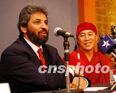 圖文:臺(tái)佛界捐款百萬港幣重修阿富汗巴米揚(yáng)大佛 2002年05月17日 16:34 ![]() 5月16日臺(tái)灣宗教界著名心道法師聯(lián)同聯(lián)合國千年世界和平峰會(huì)秘書長巴瓦金(Bawa Jain)(左)遠(yuǎn)道來港,在萬豪酒店召開記者會(huì),宣布由臺(tái)灣世界宗教博物館捐贈(zèng)一百萬港幣給阿富汗,作為重建“巴米揚(yáng)”大佛像經(jīng)費(fèi)。中新社圖 洪少葵 攝
