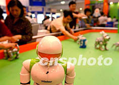 各式各樣的機器人和機器寵物薈萃一個游戲臺,為二十三日開幕的北京國際科技產業博覽會助威。中新社記者 賈國榮 攝