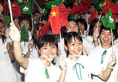 澳門教業高二的一百名學生23日晚高舉中國國旗和澳門特區區旗,歡迎中國國家足球隊的到來。中新社記者 李剛 攝