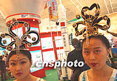 兩名扮作古代飛天仙女的甘肅公關小姐,在五月北京國際科技產業博覽會上,推介身后的中國“神舟”宇航飛船。賈國榮 攝