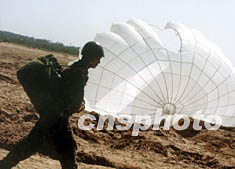 中國(guó)某空降部隊(duì)新兵,在五月的驕陽(yáng)下進(jìn)行跳傘訓(xùn)練,一位新兵收傘后急速通過(guò)同伴的降點(diǎn)準(zhǔn)備下一次跳傘。因?yàn)樘c(diǎn)準(zhǔn)確、收傘快速是他們當(dāng)前訓(xùn)練的主要目標(biāo)。王麗南 攝