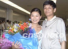 剛剛在波多黎各首府舉行的“2002環球小姐”比賽中榮獲季軍的19歲上海姑娘卓靈,十一日載譽回到北京,她的父親卓祥秉專程從上海趕赴北京首都機場,迎接女兒回家。 作者:章永哲