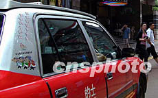香港的士同業(yè)在香港回歸祖國(guó)五周年之際,在車(chē)身裝飾慶祝標(biāo)語(yǔ),穿梭街頭。洪少葵 攝