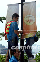 香港會議展覽中心將于7月1日舉行第二屆特區行政長官就職典禮,及慶祝香港回歸祖國五周年活動,6月28日會展中心一帶高掛慶祝標語,迎接特區成立五周年。洪少葵 攝