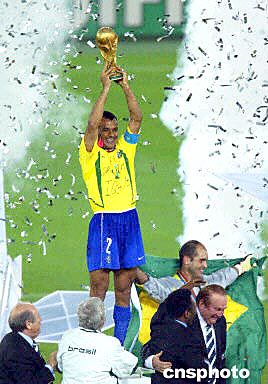 6月30日晚,2002韓日世界杯決賽巴西隊VS德國隊的比賽已經結束,最終巴西隊以2比0戰勝德國隊,羅納爾多表現出色獨進兩球。圖為巴西隊隊長卡福高舉大力神金杯。