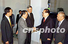 六月三十日晚,國家主席江澤民在香港出席特區(qū)政府成立五周年慶祝宴會。江澤民主席在香港禮賓府與特區(qū)政府“高官”握手。潘索菲 攝