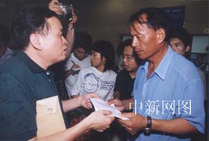 圖為福建中福公司副總經理林炎,向死難者許恒勇、李斌的家屬發送慰問金。中新社記者 劉可耕 攝
