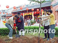 8日上午,廣東五名高考“狀元”在廣東肇慶市德慶孔廟講述各自如何學習、如何用好的心態克服人生的轉折點,贏得了該縣近二千名家長和學生的陣陣掌聲。圖為“狀元”在孔廟內種下五棵“狀元樹”。作者:黃謝