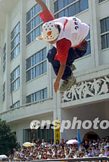 中國極限精英賽十日在北京工人體育館舉行,北京選手在滑輪街式比賽中的高難度騰空動(dòng)作令人驚嘆。 作者:史利