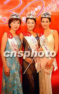 二00二年度香港小姐競選冠、亞、季軍,8月12日亮麗登場領獎會見新聞界,(左起)季軍胡家惠、冠軍林敏俐、亞軍左慧琪。洪少葵 攝
