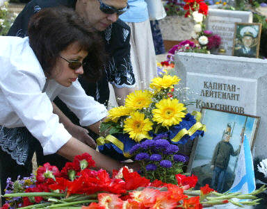 俄羅斯首都莫斯科12日舉行“庫爾斯克號”核潛艇失事兩周年紀念儀式,為118名死難者而設的紀念碑在莫斯科揭幕,幾十名海員及遇難者親友沉痛悼念葬身大海的海軍官兵。圖為遇難者家屬在紀念碑前擺放鮮花。