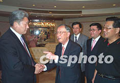 香港知名人士林百欣先生十三日在汕頭捐資四千萬人民幣,支持汕頭市圖書館新館配套設施建設。近二十年來,林百欣在汕頭以及國內其它地方捐贈社會公益事業的金額累計已達六億元人民幣。圖為汕頭市委書記李統書(左一)、市長李春洪(右一)當面感謝林百欣先生(左二)的義舉。作者:王惠存