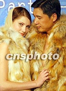 中國著名東北虎皮草集團十六日在哈爾濱舉行2003年新款皮草秀,中國著名男模張巍與俄羅斯模特同臺展示新款皮草作品。錢興強 攝