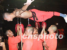 由河南少林寺武僧團演員演出的《少林雄風》大型中華武術舞臺藝術節目日前在北京天橋劇場首次正式演出,受到眾多外賓歡迎。圖為少林和尚成功地表演了驚險《五搶刺身》硬氣功節目。鄒憲 攝