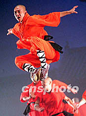 二十一日晚由中國對外演出公司和嵩山少林寺主辦的“少林雄風”演出在北京天橋劇場上演。少林武僧表演了十八般武藝,并以舞美展示了和尚的四季生活。童曙泉 攝