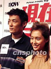 香港明星朱茵和余文樂于八月二十八日在香港宣傳其合演的音樂網(wǎng)劇。張志偉 攝