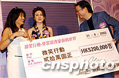 為改變中國病童的世界,好讓他們重現笑容,香港樂思富公司8月31日在時代廣場捐贈價值20萬港元產品支持 “微笑行動”慈善機構。圖為樂思富公司總經理羅宜敏【右】將支票頒給“微笑行動”代表接收。洪少葵 攝