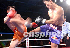 中國武術散打王爭霸賽65公斤級第四輪比賽,三日晚在北京奧體中心散打館舉行。有“南海威龍”之稱的張金龍(右)激戰“珍珠小旋風”王春明,后者最終獲得勝利,成功闖關。作者:武仲林