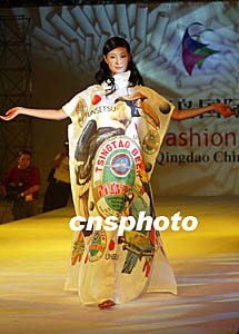 日本時裝設計師古川云雪九月周末在青島國際時裝周上,展示以鳥類與青島啤酒罐為圖案的作品,獨具匠心。 作者:毛建軍