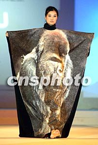 模特在九月青島國際時裝周上展示印有大猩猩圖案的時裝。由日本著名時裝設計師古川云雪設計的環境時裝,用廢舊塑料飲料瓶生產的布料制作,以號召人們加強環保意識。作者:毛建軍