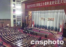 紀(jì)念中日邦交正常化三十周年友好交流大會今晚在人民大會堂舉行。一萬三千余名日本來賓會聚于此,與中方各界人士共同紀(jì)念這個對兩國人民都具有重要意義的日子。會上,江澤民主席代表中國政府和人民并以他個人的名義對這次活動的成功舉辦表示祝賀,向參加活動的各位日本朋友表示歡迎。