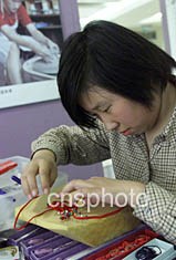 “匯豐中華慈善殘疾兒童藝術展”二十四日在北京開幕,來自培智學校的殘疾孩子在現場表演“中國結”的制作。作者:滿會喬