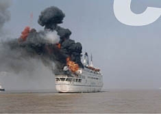 九時(shí)三十四分,“恐怖分子”驚慌從“東海一號(hào)”輪沿繩索滑下,乘快艇逃逸,兩分鐘后遇難船上便傳來(lái)兩聲巨響、火光沖天,“恐怖分子”用遙控器引爆了“東海一號(hào)”輪,剎那間,海面上濃煙滾滾--而此時(shí),水上交通管制系統(tǒng)的雷達(dá)已經(jīng)鎖定了“恐怖分子”逃逸的快艇。九時(shí)四十一分,三艘海警船在控制中心的引導(dǎo)下迅速追擊攔截、擒獲所有“恐怖分子”。
