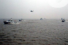 上午九時(shí)整,隨著三顆紅色信號(hào)在該水域騰空而起,一場(chǎng)中國(guó)規(guī)模最大的海上搜救演習(xí)--二○○二年海上搜救、反恐怖、溢油應(yīng)急綜合演習(xí)由此拉開(kāi)帷幕。