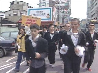 中新網9月29日電 臺中市28日有一場馬拉松比賽,參賽者比一般選手更辛苦,因為他們必須模仿影星成龍在新片中的造型,大熱天里身穿燕尾服跑一段路,還要將漏氣的腳踏車輪胎打滿氣,再騎著腳踏車到終點,才能成為贏家。