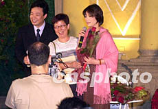 第十六屆澳門國際音樂節九日晚在澳門玫瑰堂前地舉行“蔡琴、費玉清玫瑰之約”藝術家之約活動,許多蔡琴的歌迷紛紛走上臨時舞臺向她獻上玫瑰花并輿她合影。李剛 攝