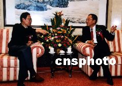 中共福建省委書(shū)記宋德福(左),十四日與專(zhuān)程前來(lái)參加中新社成立五十周年福建慶典大會(huì)的國(guó)務(wù)院僑辦副主任、中國(guó)新聞社社長(zhǎng)劉澤彭(右)親切交談
