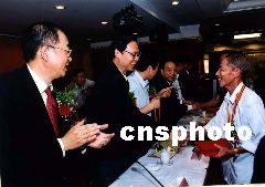 國(guó)務(wù)院僑辦副主任兼中新社社長(zhǎng)劉澤彭與福建省委書(shū)記宋德福等為中國(guó)新聞社福建分社老記者頒發(fā)紀(jì)念品 劉可耕 攝