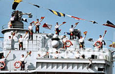 圖:水兵們在艦艇上表演旗語"祖國、你好!"